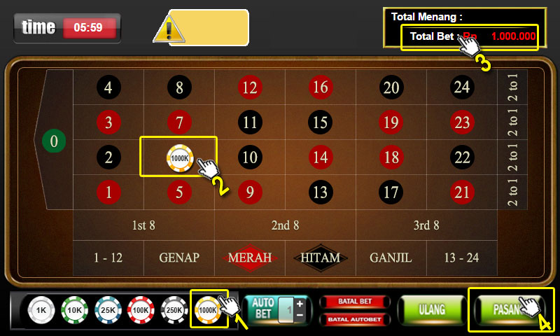 - Pertama anda harus meng-klik chip yang berada di kiri bawah untuk memilih berapa nominal taruhan anda,
