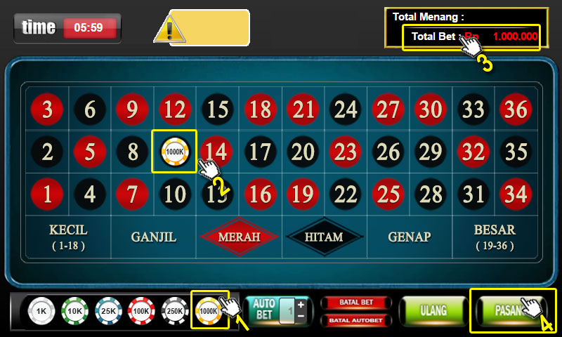 - Pilihan bet / taruhan yang bisa dipasang yaitu = kecil / besar, ganjil / genap, merah / hitam, dan pilihan angka berapa yang keluar.