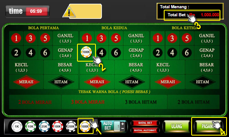 Yang pertama anda bisa menebak apakah bola pertama / bola kedua / bola ketiga keluar ganjil/genap, kecil/besar, merah/hitam, ataupun menebak langsung angka yang keluar.